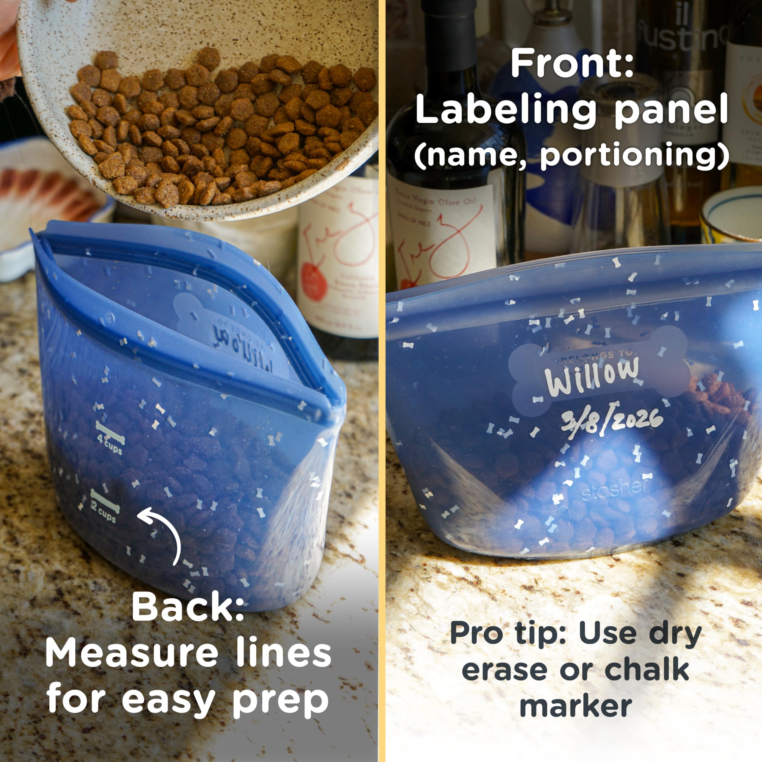 - PORTABLE LEAK-FREE DOG FOOD CONTAINER W/ PINCH-LOC SEAL: Our 4-cup, portable dog food travel container features Stasher’s patented Pinch-Loc airtight seal to prevent leaks, spills, and odors. Includes measurement lines and a writable panel for labeling and portioning.