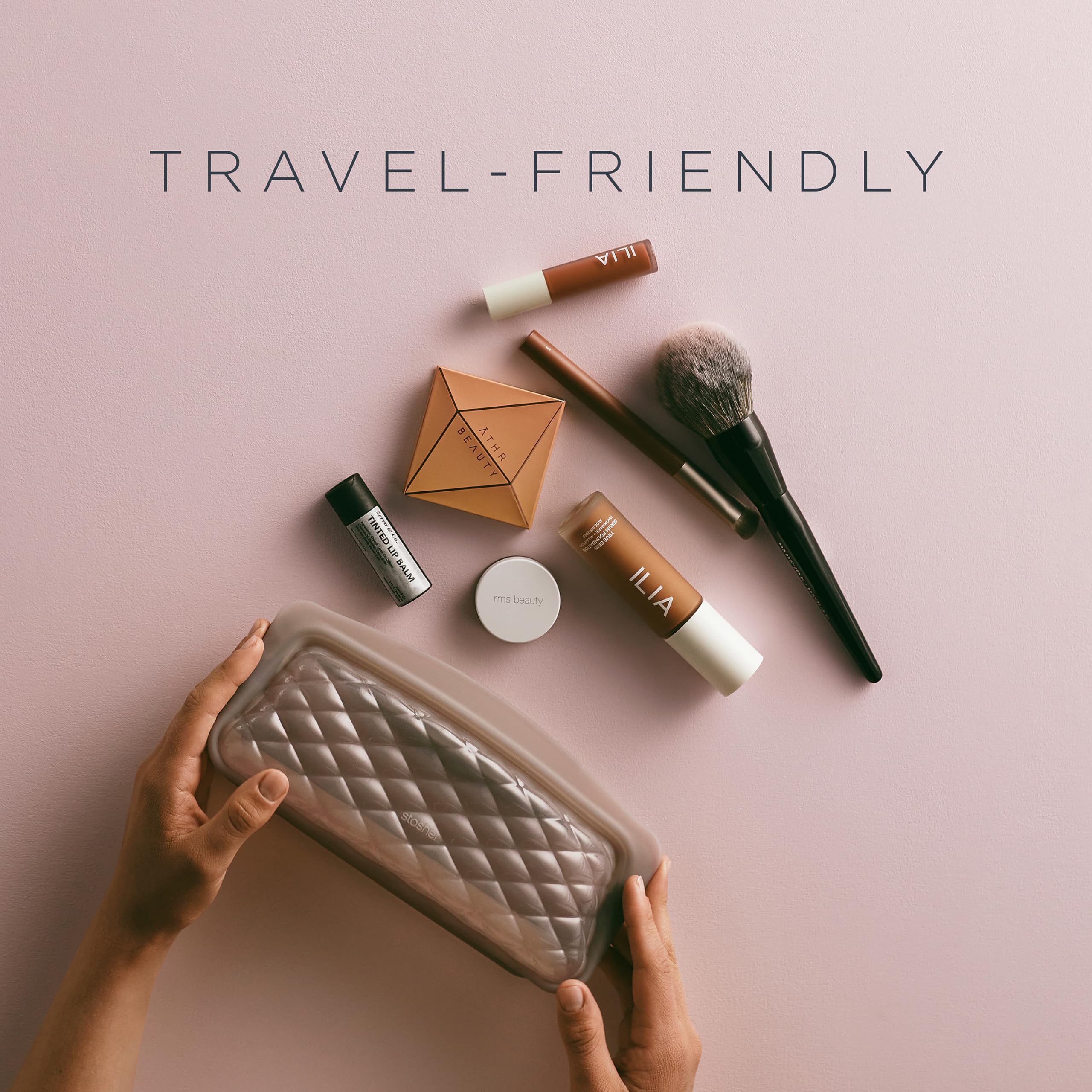 - CONTAINS: 3 Stasher Silicone Reusable Makeup Beauty Bags in the color Taupe. Includes 1 Everyday Bag (26 Oz), 1 Essentials Bag (28 Oz), and 1 Touch-up Bag (12 Oz).
