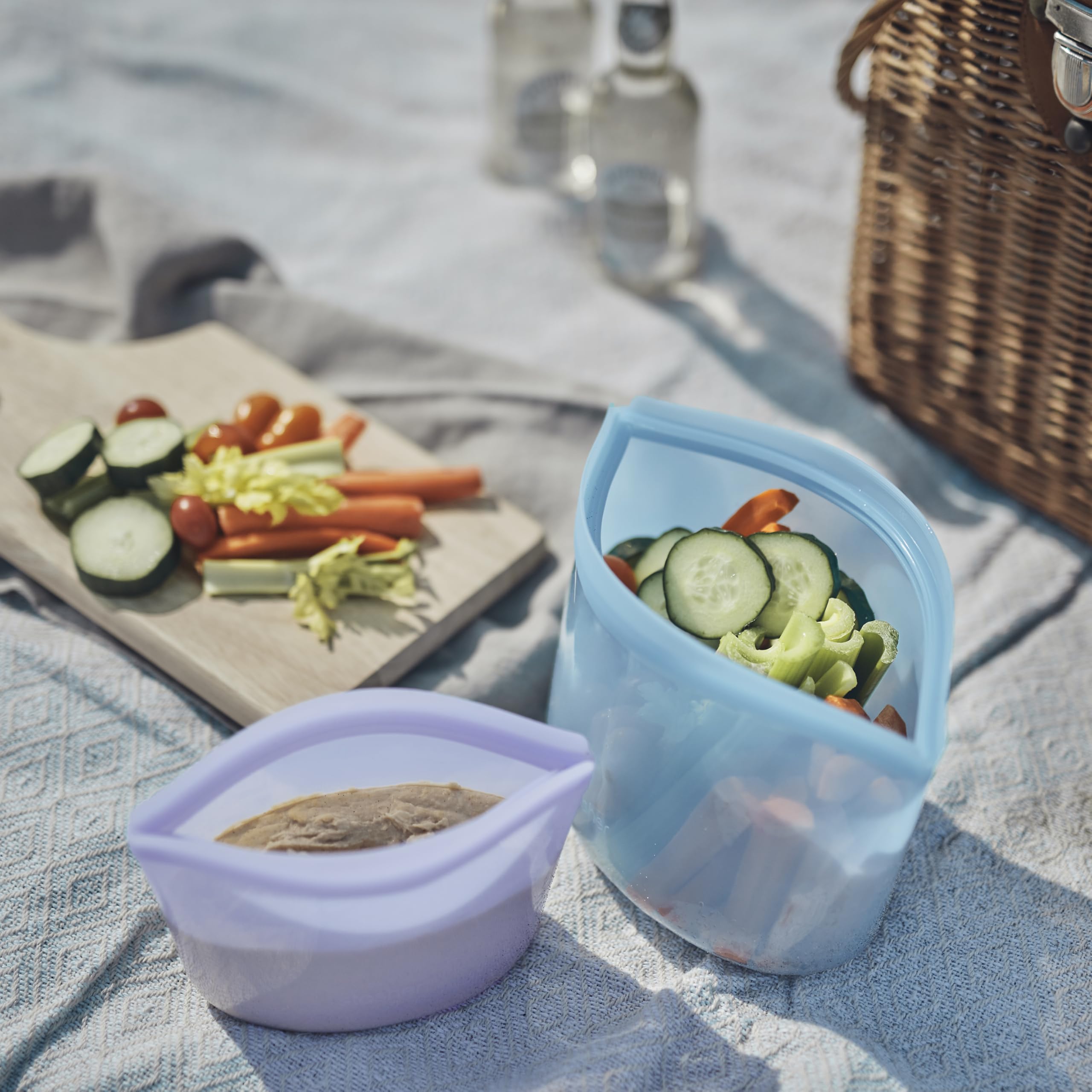 - CONTAINS: 2 Stasher Reusable Silicone Bags and 2 Silicone Bowls in the colors Blue + Lavender. Includes 1 Sandwich (28 Fl Oz), 1 Snack (12 Fl Oz) Bag, 1 Cup (8 Fl Oz), and 2 Cup (16 Fl Oz) Bowl.